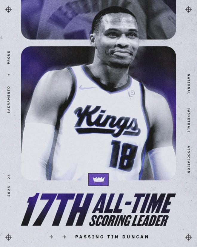 威少送出了全场最多的助攻,率队实现了5人得分上双。威少在场上拼劲十足,但是无力扭转场上局面。此役,威少还迎来了里程碑。次节初段,威少在篮下得分,其生涯得分(26498分)超越邓肯升至NBA历史第17!