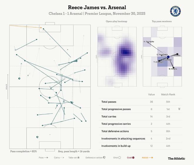 作为与凯塞多搭档的中场之一,里斯-詹姆斯是切尔西今晚最耀眼的球员。